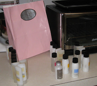 In other news, I was commiserating with a friend over how our husbands go on these business trips and only ever bring us back the soaps and shampoos from the hotels (her husband’s haul is generally considerably more ritsy than mine’s), and she carted out a tub full of stuff. I mentioned how much my younger son would love such a selection–he loves those tiny little bottles, and then the conversation moved on to something else. My boys then played at her house for an hour or so, and then came home, the little one carting a pink gift back full of the aforementioned little bottles.
