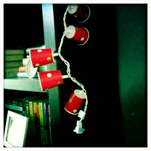 A good friend dropped off an early Christmas present at my house this morning…this little homemade string of lights–made with plastic Dixie Cups and decorative paper–tucked into this Santa bucket tote. Love.