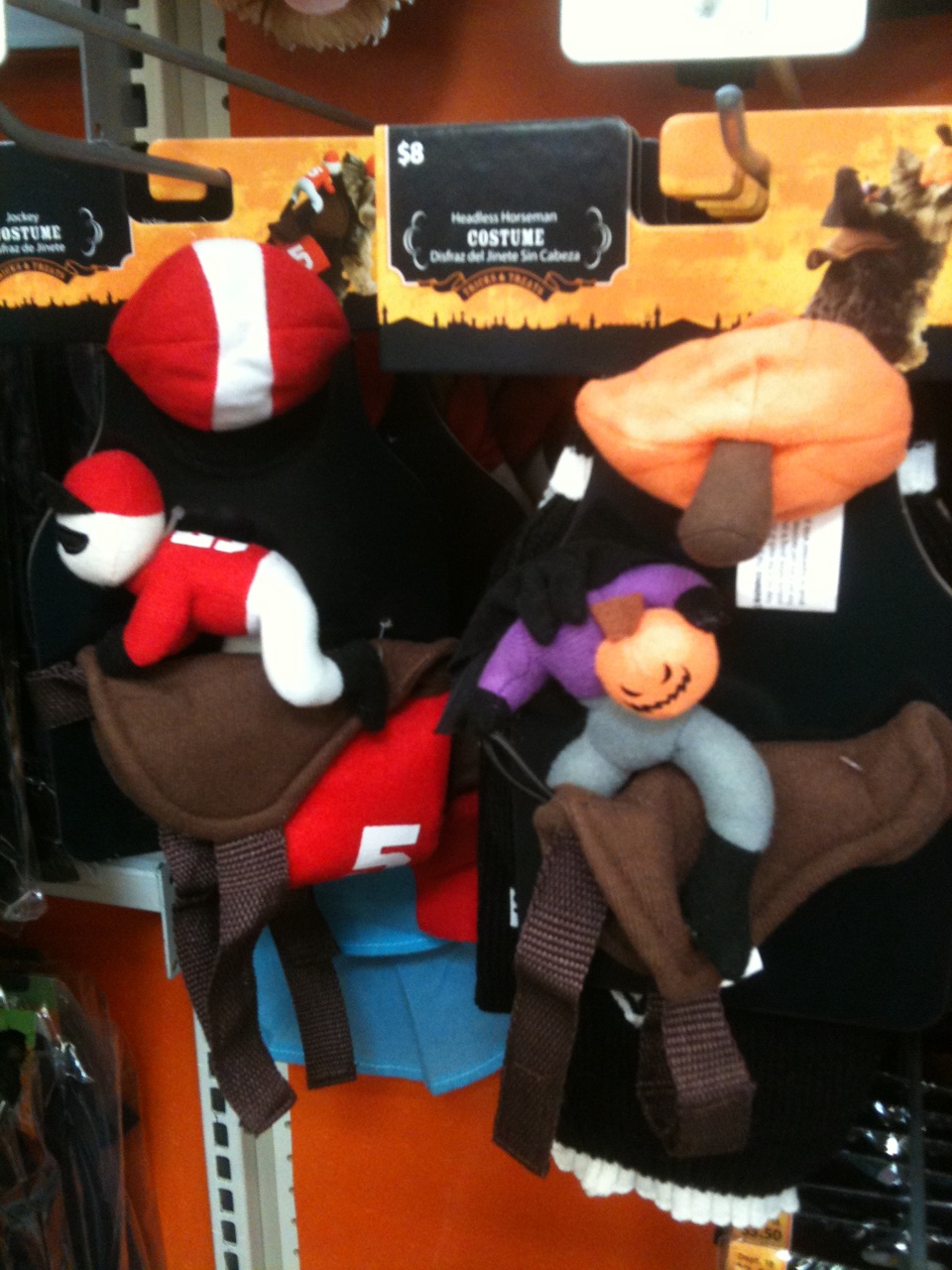 I saw these pet costumes in Walmart before Halloween, and would have loved to see an animal wearing one of them (particularly the headless horseman). A dog would have been cuter, but a cat, waaay more hilarious…but sadly, I didn’t see any pets in costume on the big day.